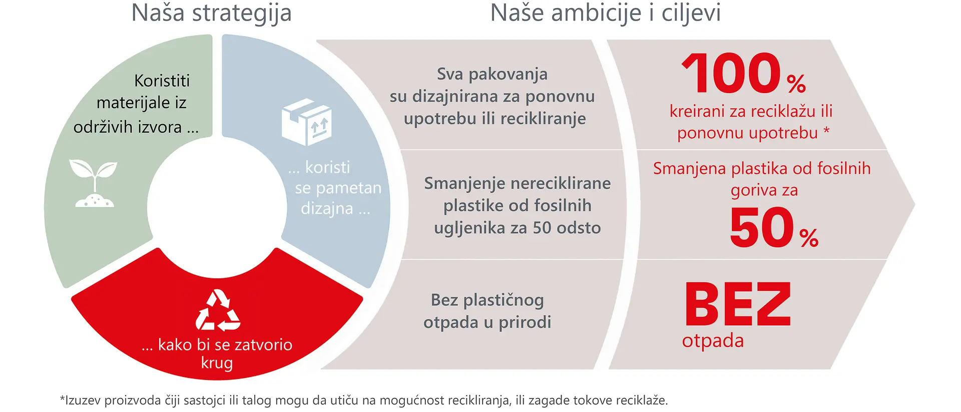 Eliminacija, smanjenje i reciklaža materijala za pakovanje (gde to nije moguće), posebno za našu potrošnu robu, najbolji je način da se smanji otpad i povezani negativni uticaji na životnu sredinu. Naš cilj je da smanjimo količinu materijala za pakovanje koji koristimo na minimum – bez ugrožavanja kvaliteta, performansi ili bezbednosti naših proizvoda – i da potrošačima pružimo sve informacije koje su im potrebne za bezbednu upotrebu i pravilno odlaganje. Uz nekoliko izuzetaka, danas je naše pakovanje razvijeno da obezbedi nivo performansi koje potrošači očekuju, uz maksimalno smanjenje upotrebe resursa. Pored toga, naša ambalaža se može odložiti u postojeće sisteme za prikupljanje i reciklažu.